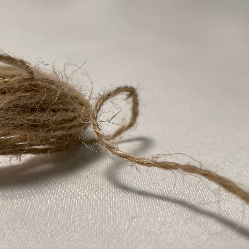 É um fio fino feito em juta 100% natural, com construção de 2 cabos (duas torções/pernas entrelaçadas), com aspeto rústico e textura natural.